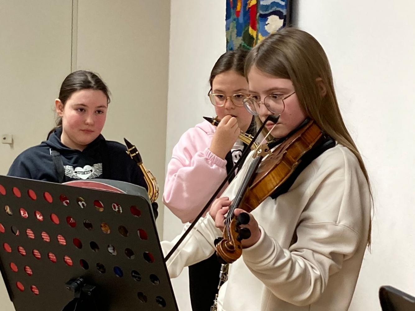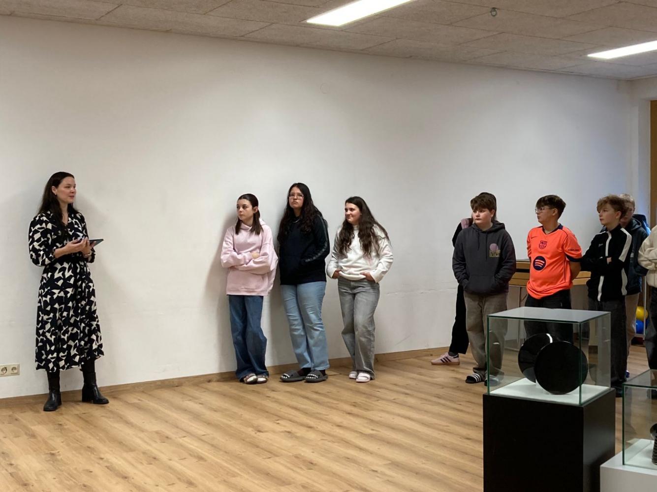 Für die musikalische Umrahmung sorgten Schüler:innen der 1. und 2. Klasse der MS Oetz. Während Sophie und Jenni Stücke auf der Geige präsentierten, spielten Julia und Mia am Saxophon, rhythmisch begleitet mit Klanghölzern und Rasseln von Marie-Sophie, Yasin und Milow. Nach der Eröffnung führte Kuratorin Nina Hütter die Schüler:innen der 2. und danach der 3. Klassen durch die Exponate. Dabei hatten die Jugendlichen die Gelegenheit, Fragen zu stellen und ihre persönlichen Favoriten genauer unter die Lupe zu nehmen.